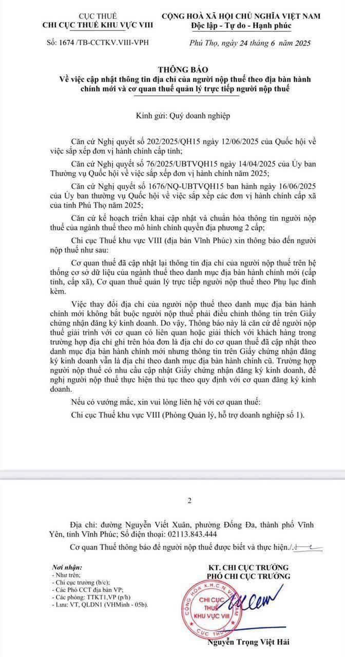 Kể từ ngày 01/07/2025 Trên hệ thống cơ quan thuế sẽ cập nhật và chính thức hoạt động theo địa chỉ chính quyền 2 cấp và theo quản lý của 34 cơ quan thuế tương ứng với 34 tỉnh thành, nên kế toán và doanh nghiệp chỉnh lại thông tin theo địa chỉ mới trên phần mềm hóa đơn theo hướng dẫn tại Nghị định số 123/2020/NĐ-CP, Nghị định số 70/2025/NĐ-CP rồi sử dụng hóa đơn bình thường không cần nộp mẫu 01.