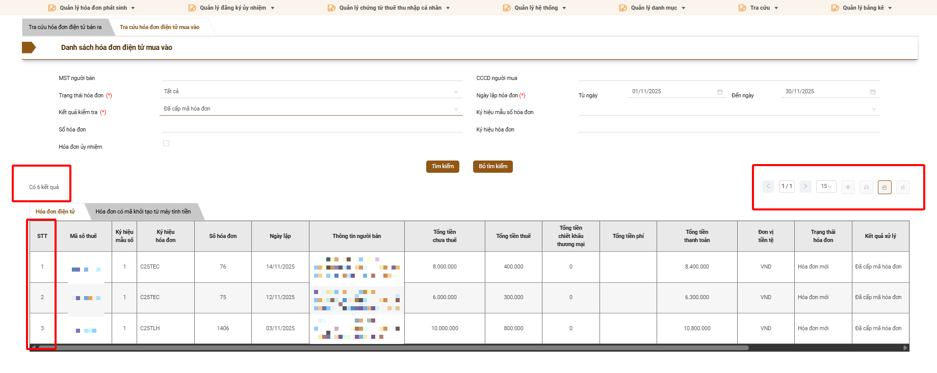 Chào anh chị, cho em hỏi khi em tra cứu những hóa đơn đã cấp mã của tháng 11 thì hệ thống hiện có 6 kết quả, nhưng em chỉ xem được 3 hóa đơn, xuất ra bảng kê excel cũng chỉ có 3 hóa đơn đó, có ai gặp lỗi này chưa ạ