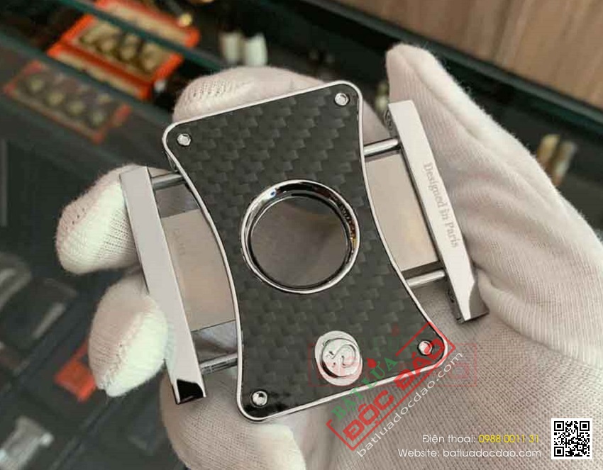 Dao cắt xì gà Caseti CA113 thiết kế hình chữ nhật với 2 tay cầm 2 bên hông, thân dao được trang trí bởi họa tiết vân carbon, phía trên còn có nút bấm mở khóa tự động.