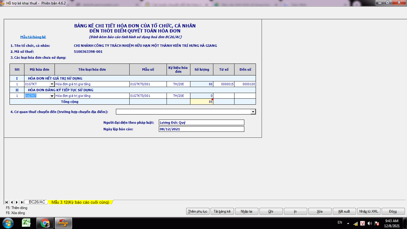 Bước 4: Sau khi nhận được thông báo chấp nhận cho sử dụng hóa đơn điện tử theo Thông tư số 78/2021/TT-BTC, Doanh nghiệp lập và nộp báo cáo tình hình hóa đơn mẫu BC26 có đính kèm phụ lục 3.12 quyết toán hóa đơn giấy, hóa đơn điện tử cũ không còn giá trị sử dụng như hình minh họa.