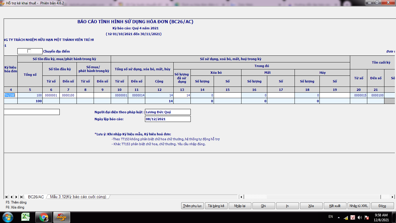Lưu ý trong báo cáo BC26 lần này không có nhập hóa đơn hủy mà đợi khi làm báo cáo BC26 cho quý 04/2021 thì chúng ta mới gõ vào ô hủy nhé. Vẫn biết hóa đơn điện tử là không cần báo cáo tình hình sử dụng hóa đơn, nhưng quý 04/2021 đang giao thoa giữa cũ và mới thì chúng ta vẫn báo cáo nhằm tránh rắc rối khi thanh tra, kiểm tra sau này.