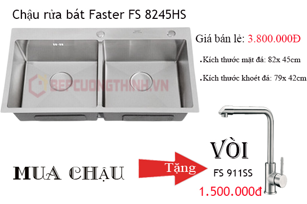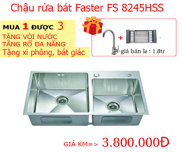 Chậu rửa bát Faster FS 8245HS được thiết kế với 2 hố lệch mang đến cho bạn sự tiện ích,quá trình sử dụng tiện ích hơn và tiết kiệm thời gian tiết kiệm nước khi bạn sử dụng hố nhỏ.Chậu sử dụng chất liêu inox cao cấp,sáng bóng dễ vệ sinh không an ăn mòn, không gây hại cho sức khỏe. Bộ xi phông làm bằng nhựa chịu nhiệt quá trình chế biến bạn đổ trực tiếp dầu mỡ hoặc nước nóng vào chậu không hề gây ảnh hưởng gì.2 bát giác bằng inox khi sử dụng tránh tình trạng trào ngược gây khó chịu.Bên ngoài chậu được phủ lớp xi phông chống ồn khi xả nước không gây ồn ào khó chịu.Đặc biệt bạn được tặng ngay một chiếc vỏi nóng lạnh FS 911S khi mua chậu.