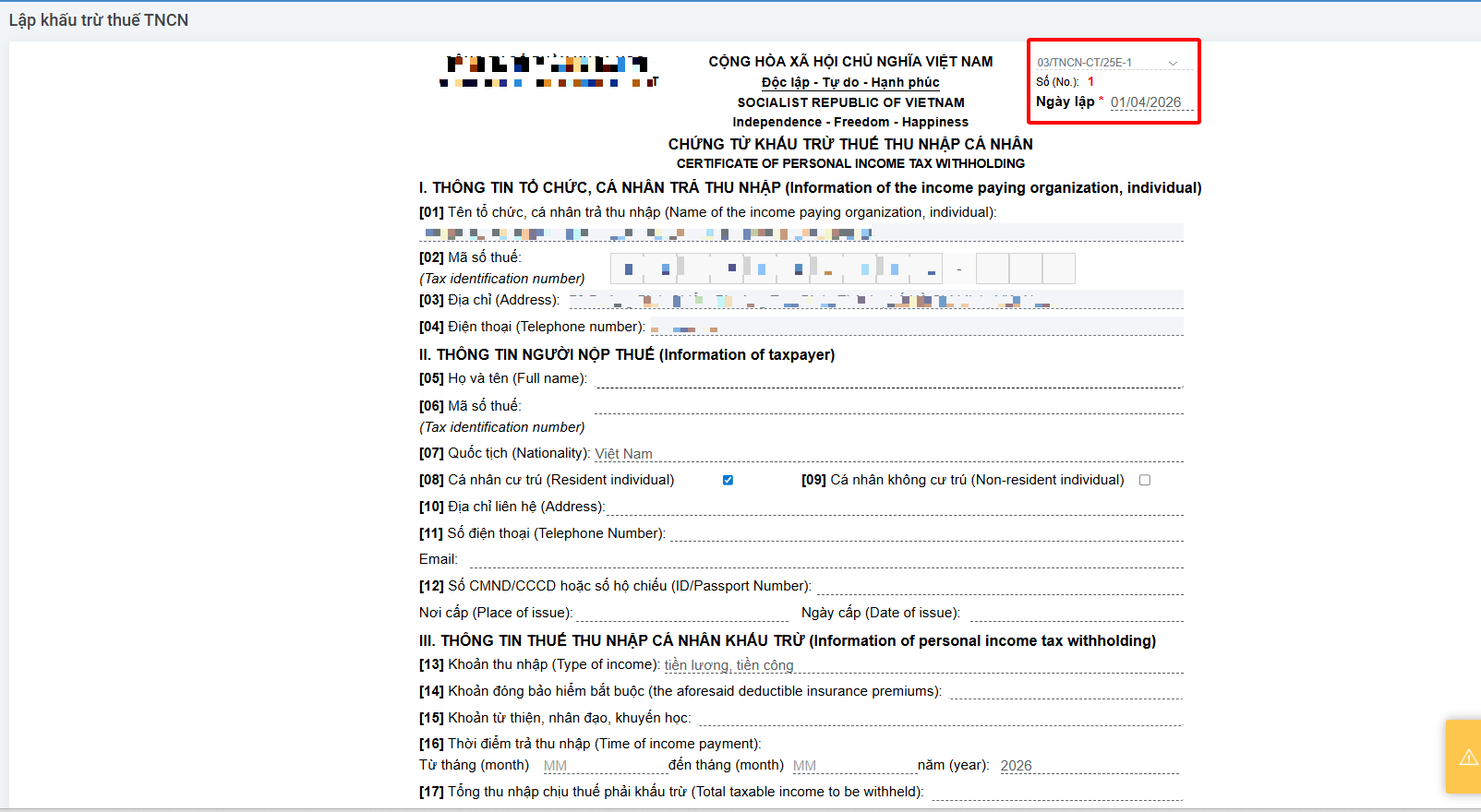 Chào anh chị, đây là lần đầu em xuất chứng từ khấu trừ thuế TNCN, cho em hỏi xuất theo mẫu này đúng không ạ, có cần đăng kí không hay cứ điền thông tin rồi ký số thôi là xong ạ