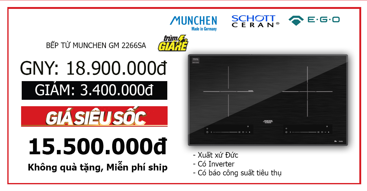 Bếp từ đôi Munchen GM 2266SA là mẫu sản phẩm mới ra mắt từ tháng 5/2022 để đánh giá về kính linh kiện cũng như chất lượng thì xin phép được chia sẻ ở các bài viết sau. Tuy nhiên điều chúng tôi muốn nhấn mạnh ở đây chính là mức giá bán siêu sốc của sản phẩm này hiện là 15,5 triệu không quà tặng, miễn phí ship COD toàn quốc
