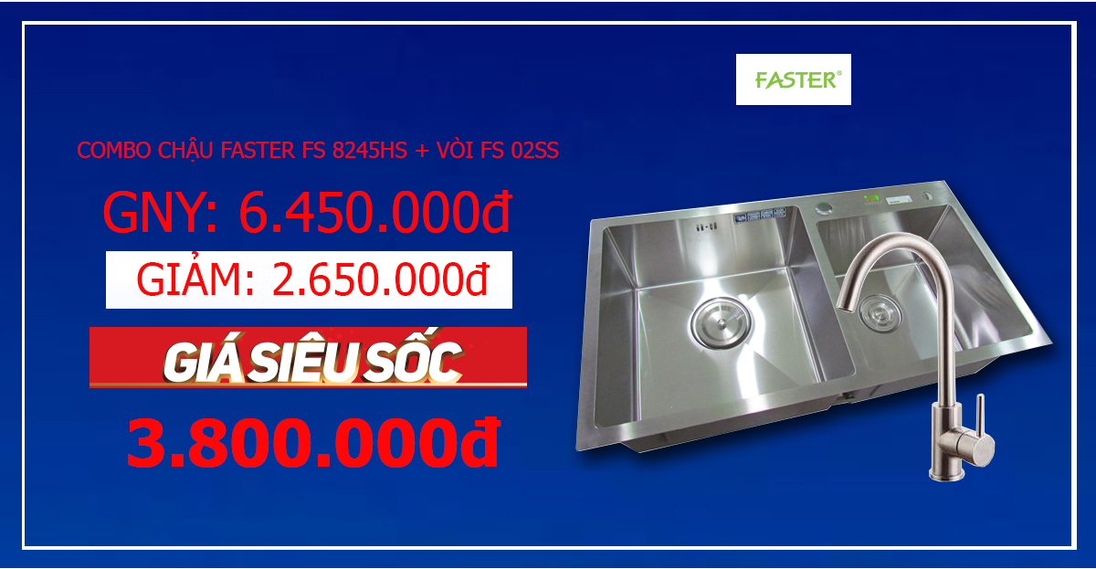 Mua 1 được 2 Combo chậu vòi rửa bát Faster vẫn chưa khi nào hết HOT, chỉ với giá 3,8 triệu bạn đã sắm ngay cho gia đình bộ sản phẩm bao gồm 1 chậu rửa bát full phụ kiện + vòi rửa bát nóng lạnh + rổ inox cao cấp.