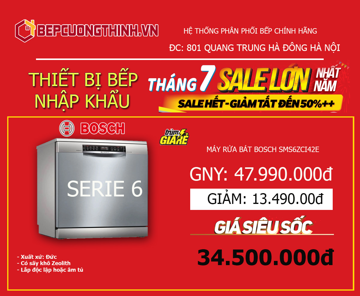 Máy rửa bát Bosch SMS6ZCI42E là mẫu máy rửa bát độc lập thương hiệu cao cấp được nhập khẩu nguyên chiếc từ Đức. Sản phẩm được tích hợp nhiều công nghệ mới nhất hiện nay như Công nghệ sấy Zeolith thật tuyệt với giúp bát đĩa sạch và khô hơn, công nghệ này hiện đang được nhiều chị em quan tâm, công nghệ điều khiển giọng nói, có thể kết nối Internet hay như tính năng rửa tăng tốc.... Hiện mức giá siêu sốc của sản phẩm là 34,5 triệu đã được giảm 13,490,000đ so với giá niêm yết