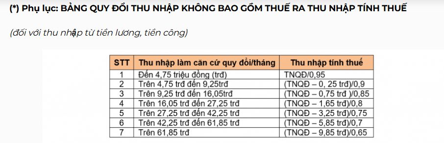 Cho em hỏi nhà mình có bác nào có bảng quy đổi thu nhập tính thuế từ NET sang Gross theo cách tính mới không ạ?