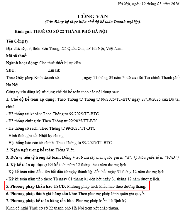 Công ty em mới thành lập, bên em có gửi lên thuế Công văn Đăng ký thực hiện chế độ kế toán Doanh nghiệp (như hình kèm theo). Trong CV có nói đến phương pháp trích khấu hao. Vậy bên em có phải làm riêng Thông báo phương pháp khấu hao tài sản cố định tới CQ thuế trước khi sử dụng TSCĐ ko ạ?