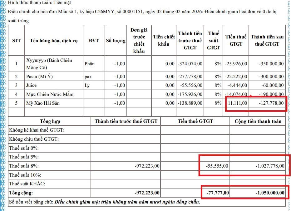 E chào ac trong web ạ.Dạ, e có lập hóa đơn điều chỉnh về 0 cho hóa đơn sau trên phần mềm Misa Meinvoice. Tuy nhiên do nếu hóa đơn điều chỉnh kế thừa hóa đơn gốc thì cột thành tiền sau thuế GTGT ko ghi âm nên e cop số và ghi âm của hóa đơn cũ. Tuy nhiên do chưa ghi âm hết nên hóa đơn điều chỉnh của e bị sai như sau ạ. E xin hỏi ac hướng giải quyết trường hợp này ạ