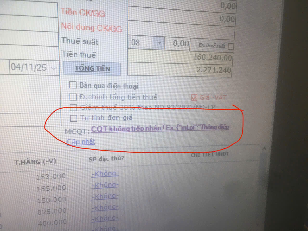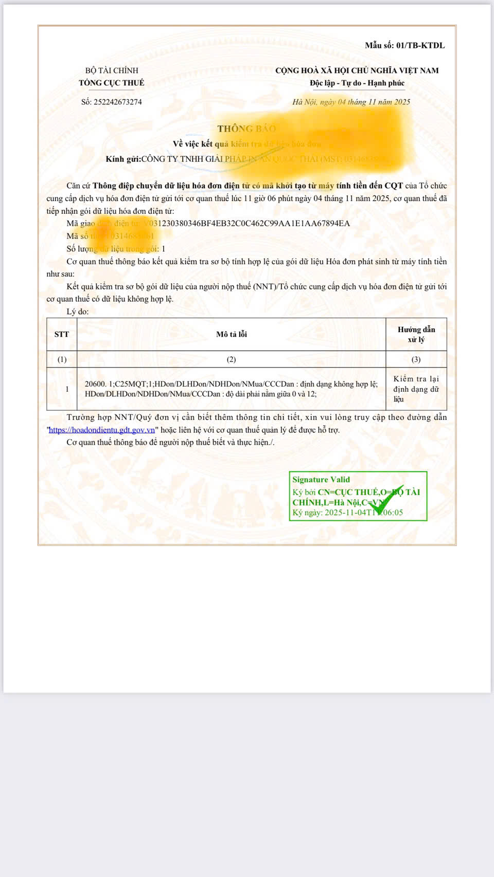 khi em xuất thì em ghi nhầm CCCD nên bị sai nhưng hóa đơn em vẫn thấy hiện mã của Cơ quan thuế, Trong phần mềm xuất hóa đơn thì báo Thuế không tiếp nhận và em cũng nhận được thông báo của thuế là hóa đơn bị sai (Lỗi định dạng CCCD không hợp lệ) như hình em gửi ạ