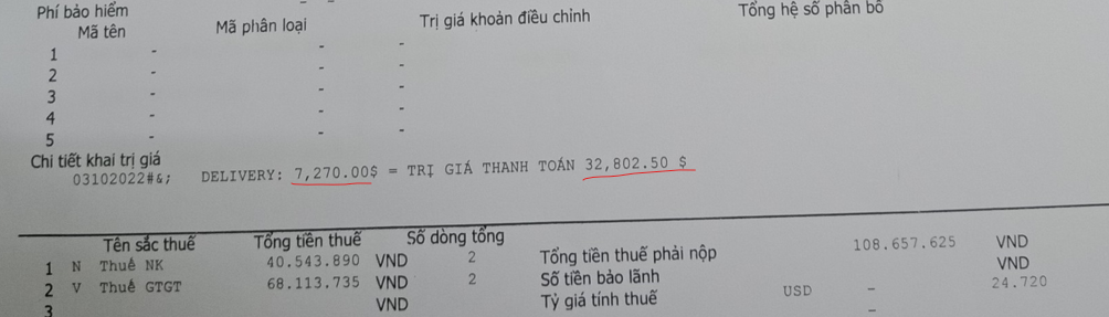 1 Trên tờ khai có cả phí vân chuyển là 7.270$ và giá trị hàng hóa là 32.802,5$. Tờ khai này có 2 mã hàng hóa. bây giờ phí vận chuyển em phải phân bổ cho 2 mã hh đúng ko ạ
