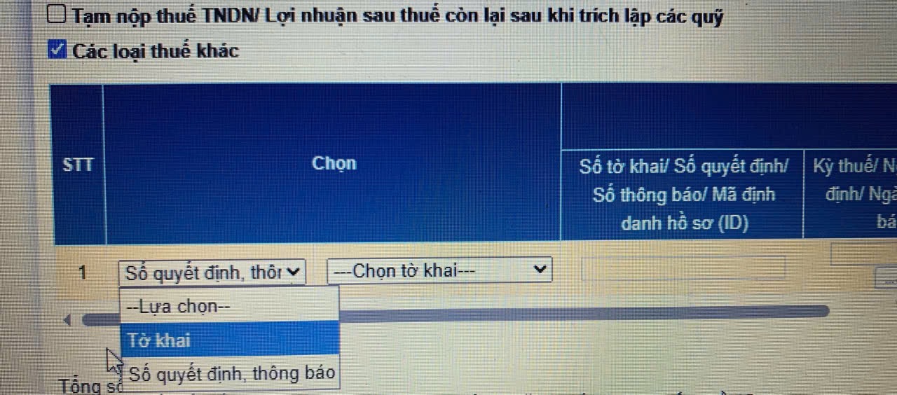 Anh chị cho em hỏi khi tạm nộp thuế GTGT thì ở cột “Chọn” như ảnh em tích vào Tờ khai hay Số quyết định/Số thông báo ạ.