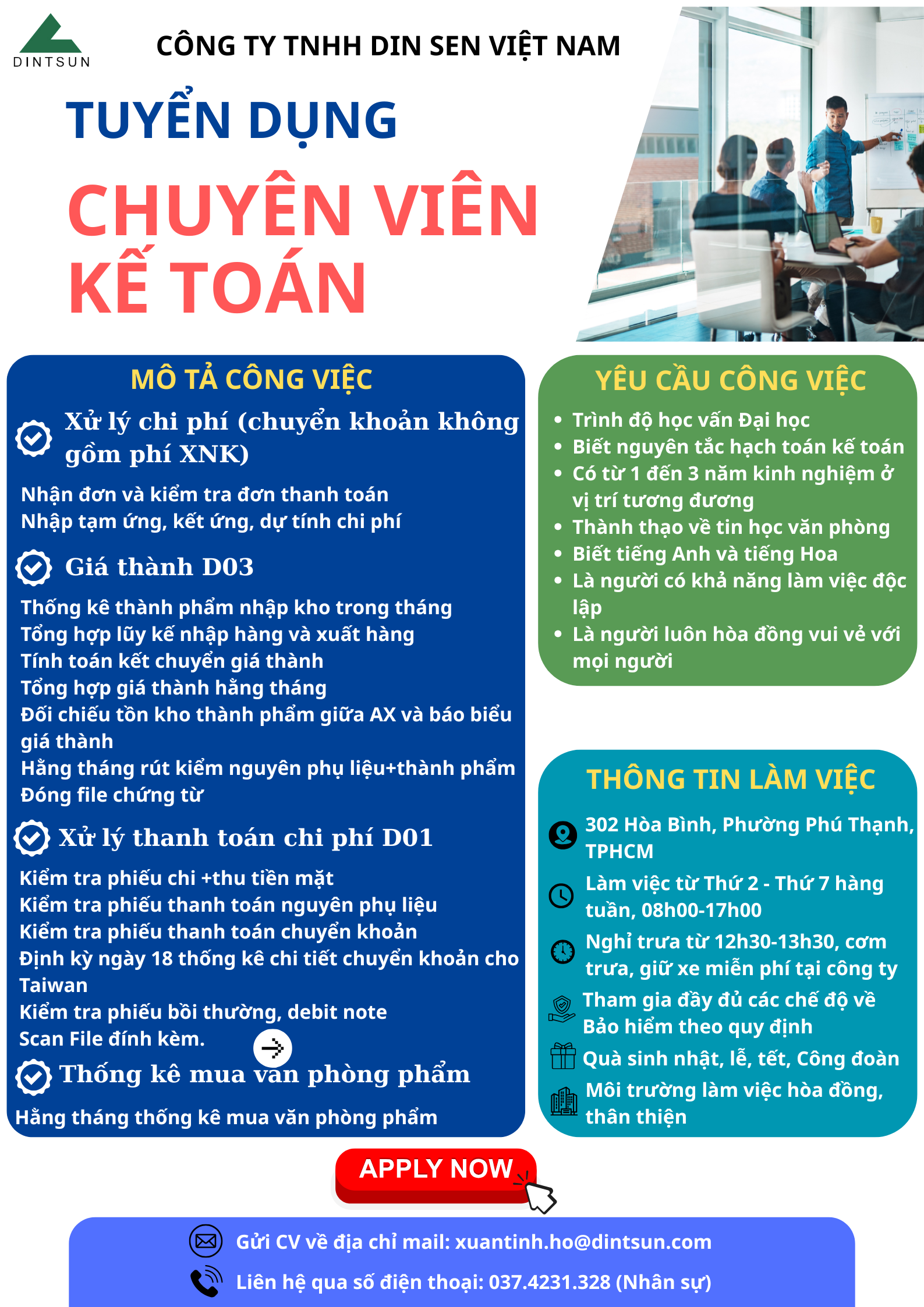 Gửi CV về: xuantinh.ho@dintsun.com. Nội dung: [CV_HỌ TÊN_CHUYÊN VIÊN KẾ TOÁN]