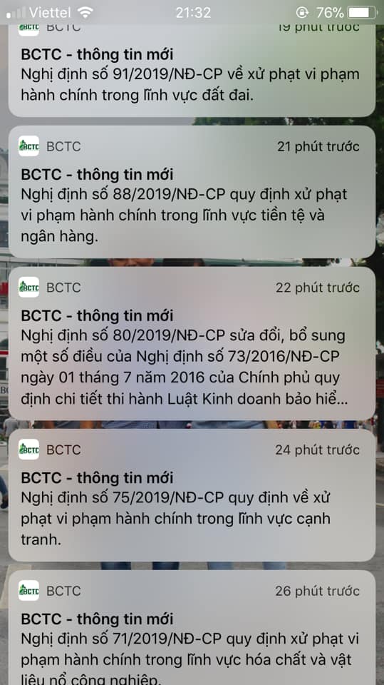 Chiều cho tới giờ 21h post hơn 80 cái nghị định về xử phạt tất cả các lĩnh vực, Bà con cô bác ai xài APP BCTC chắc bị báo liên tục!